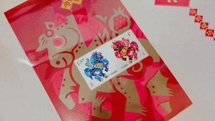 套装中还含有一张贺年小全张,里面含有两枚邮票:《跃马添福》面值1.20元、《鸿运驰春》面值3元。两枚邮票图案色彩不同但构图互为反转,共同构成奔腾的骏马形象。