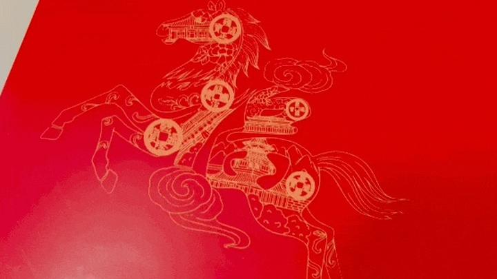 贺卡整体采用火红的设计,营造出红红火火的氛围,整体以马的设计为主题,祥瑞气氛十足。