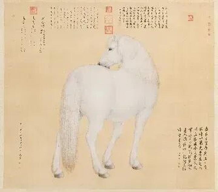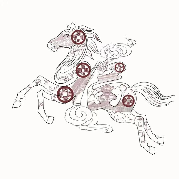 册子首页和内页上的马来自于故宫的“皇家御马”,原型取自故宫博物院藏《乾隆皇帝大阅图》“赤花鹰”。
