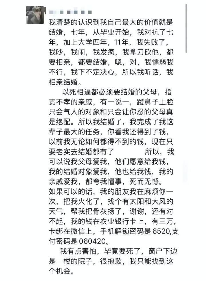 与其在学校中的形象形成反差的,是围绕其家庭和感情生活的多种猜测。魏某在朋友圈中提道:“以死相逼都要结婚的父母……所以我结婚了,我完成了我这辈子最大的任务。”这些内容被部分网友解读为其离世和“被逼婚”有关。