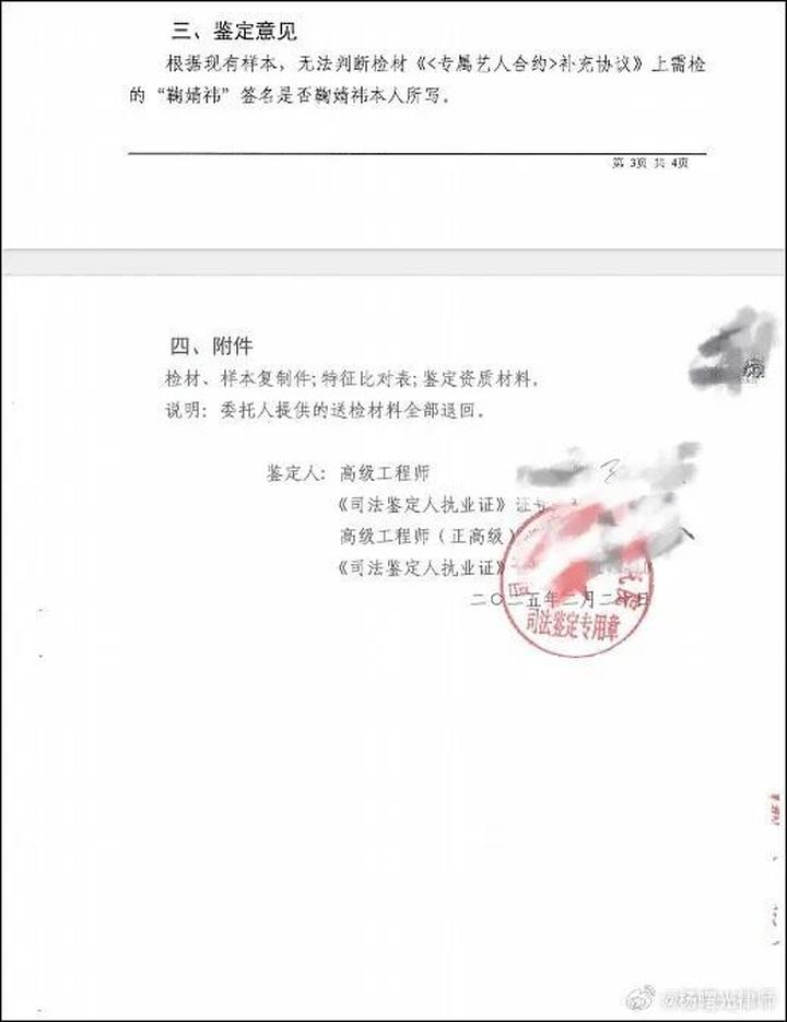 12月16日,上海丝芭文化传媒集团@丝芭传媒 称已经委托具备司法鉴定专业资质的鉴定机构就笔迹进行鉴定,称2018年的《<专属艺人合约>补充协议》是鞠婧祎所签,鞠婧祎应当继续履约。