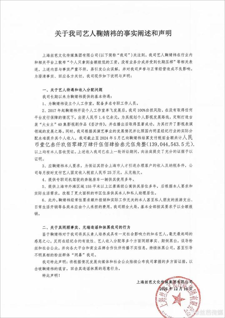随后,@丝芭传媒 发布“关于我司艺人鞠婧祎的事实阐述和声明”,称鞠婧祎在行业内和相关平台上散布“个人只拿到金额极低的工资,没有业务分成并受到长期压榨”等相关表述,与事实严重不符,并就鞠婧祎待遇和收入分配问题作出说明。