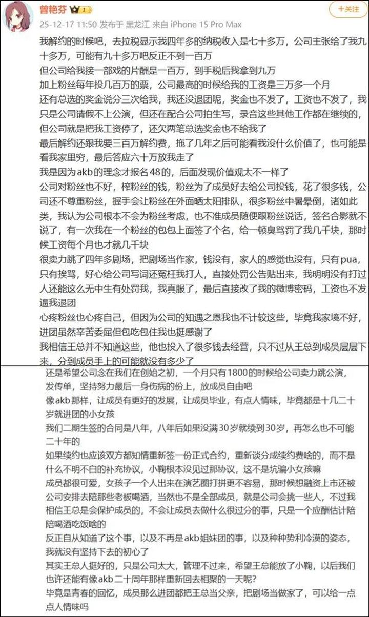12月17日,鞠婧祎前队友、因与丝芭解约赔款的SNH48二期生曾艳芬发文声援鞠婧祎,为这场商业纠纷提供了另一方的视角。