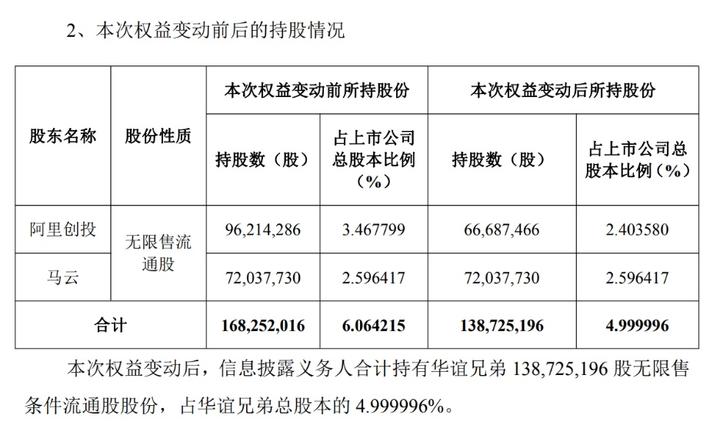 华谊兄弟表示,本次减持有利于公司股权结构的稳定,不会对公司正常经营产生不利影响。本次变动之后,阿里创投及其一致行动人马云不再是华谊兄弟持股5%以上股东。本次权益变动不会导致公司控股股东、实际控制人发生变更。
