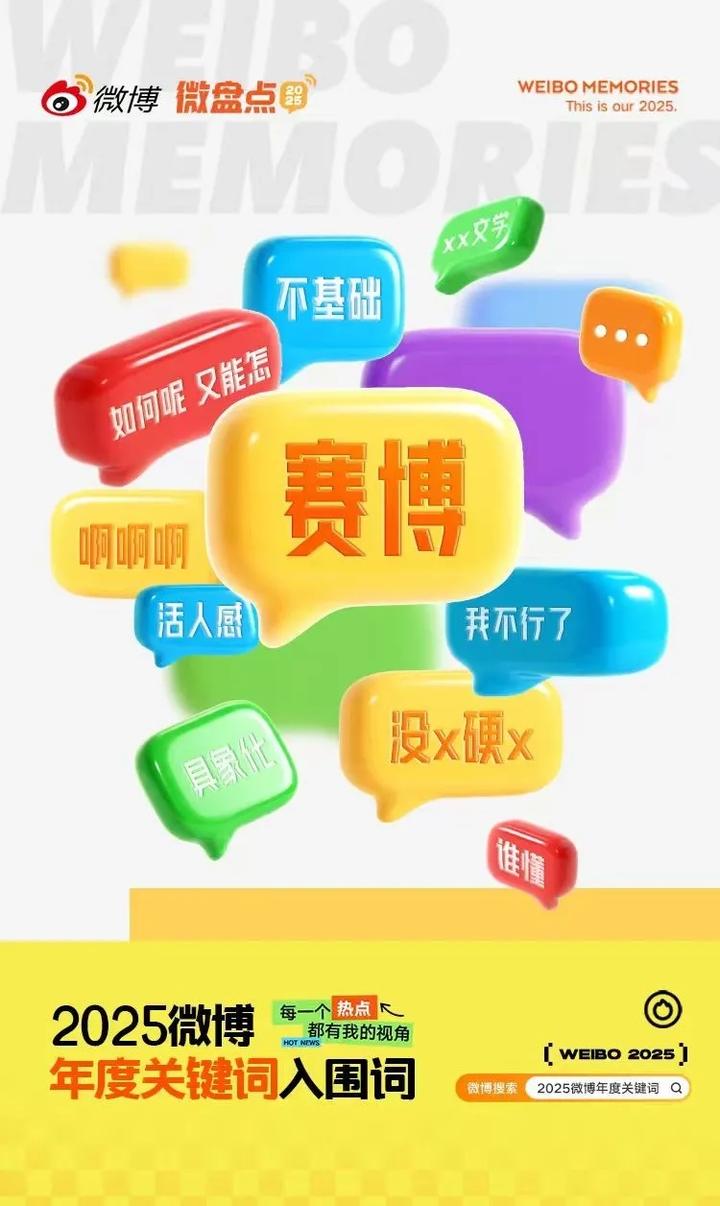 从微博的2025年度热词总结里,可以看到网友的集体智慧:随时随地“赛博”;嬉笑怒骂全都塞进四个字——“我不行了”;发表感慨的共同方式是“啊啊啊”,而“啊”的个数代表感情的程度……这些使用量动辄几千万甚至过亿的热词,反映着人们在这一年中的群体情绪波动,其中“赛博”以1.5亿次的提及,成为最具代表性的集体行为。