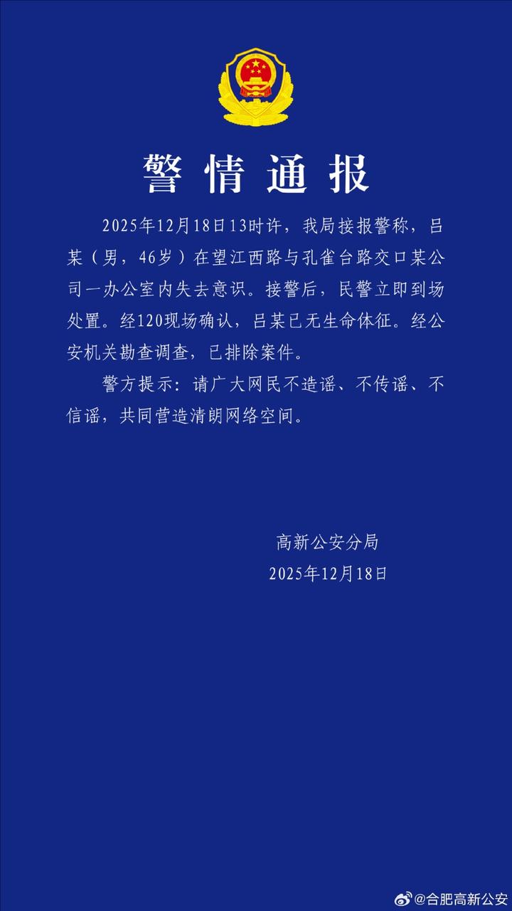 2025年12月18日13时许,我局接报警称,吕某(男,46岁)在望江西路与孔雀台路交口某公司一办公室内失去意识,接警后,民警立即到场处置。经120现场确认,吕某已无生命体征。经公安机关勘查调查,已排除案件。