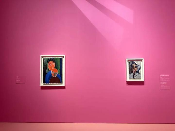 展览现场,“粉红女子:《阿维尼翁的少女》之序幕”板块,右为《女人或水手胸像》(《阿维尼翁的少女》研习稿),展墙上还模拟了阿维尼翁的阳光。