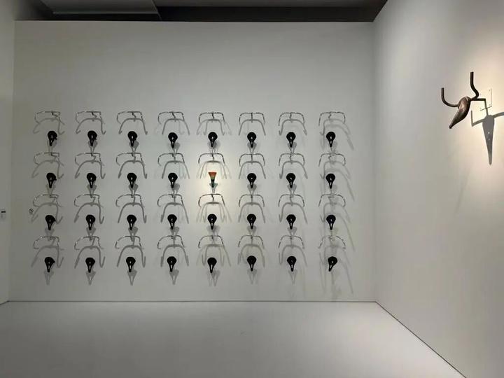 展览一开始,就出乎大部分人的意料,一件由自行车鞍座和把手焊接而成的《牛头》,与一墙当代鞍座和把手呼应。