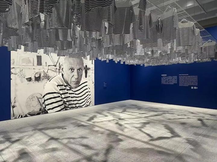 不同于美术馆的白盒子空间,“非常毕加索:保罗·史密斯的新视角”(下简称“非常毕加索”)呈现的是一个个色彩斑斓的空间。从蓝色时期的忧郁、到玫瑰时期的阳光灿烂、再到立体主义、拼贴时代……每一个时期,化为展墙的不同色彩与肌理,也化作不同质地地面的不同质感,甚至是悬于展厅上方的条纹海魂衫——鲜明的色彩、富有趣味的方式,以及对材质与图案的游戏性运用,让观众与毕加索之间变得亲近。