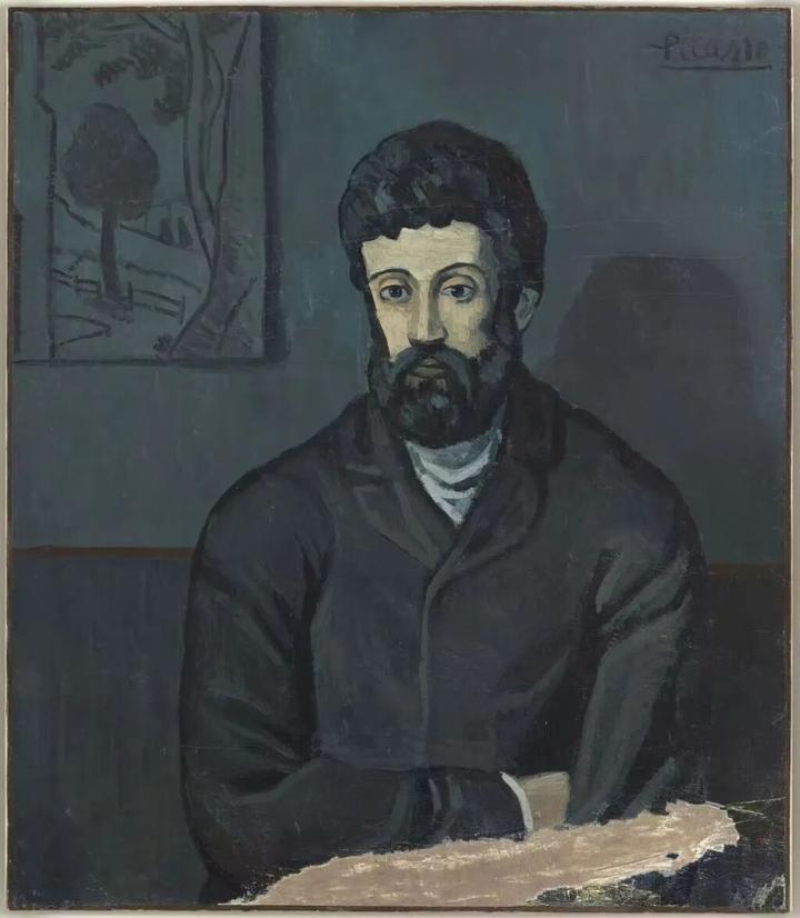 通道的尽头、一片忧郁的蓝色中,《男人肖像》静静悬挂,引领观众走入一片无声的孤独。在此,毕加索描绘了一个面无表情的男人:他望向虚空、目光迷离,同时蜷缩着身体,双臂交叉,颓然坐在咖啡馆的长椅上。