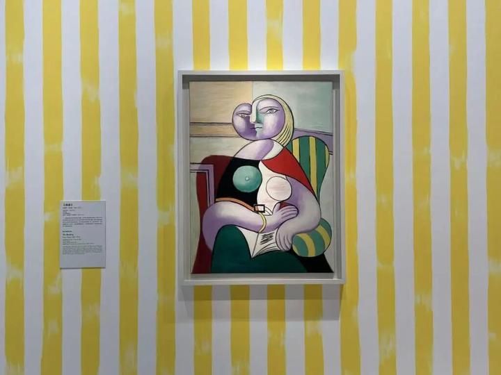 作为展览主视觉之一的《阅读》(1932)展现了毕加索在“玛丽–特蕾兹·瓦尔特时期”的肖像语言:圆润的曲线与流动的色彩塑造出柔和却结构清晰的形象。保罗·史密斯从画中提取“条纹”元素,将其延伸至展厅墙面,使观众在空间中获得更直接的视觉体验。