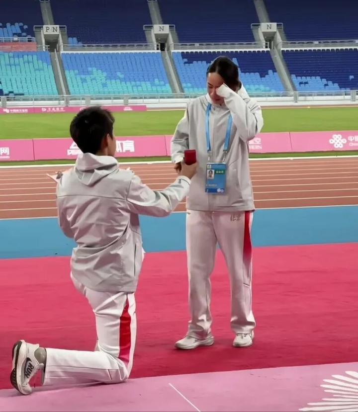 很快,旁边合影的人散开了。张萌宇手捧鲜花,单膝跪下,又拿出早已准备好的戒指,他用手语表示:“以前我们约定好了,我刻苦训练两年成功夺冠,终于向你求婚,嫁给我吧!”