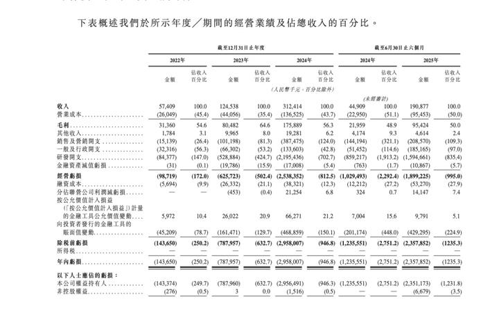 港交所披露的聆讯后资料集显示,智谱于2022年、2023年、2024年、2025年上半年实现营收5740万元、1.245亿元、3.124亿元、1.9亿元(人民币,下同),2022年至2024年连续三年营收翻倍,复合年增长率达到130%;毛利率分别为54.6%、64.6%、56.3%、50%。
