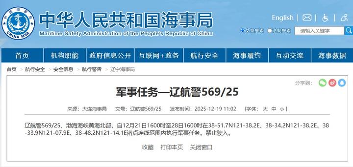 据中国海事局网站消息,大连海事局发布航行警告,12月21日16时至28日16时,渤海海峡黄海北部部分海域执行军事任务,禁止驶入。