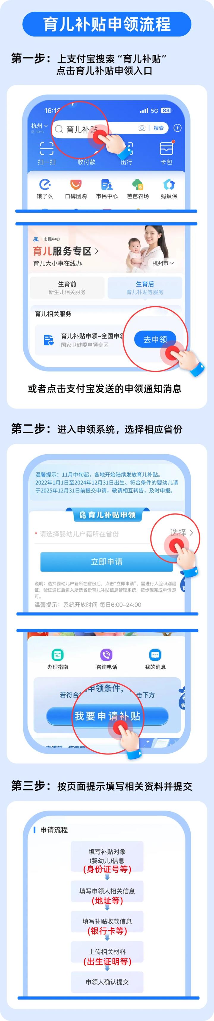 还没有申领2025年度育儿补贴的宝爸宝妈, 线上可通过支付宝申领,步骤如下: