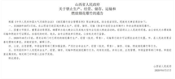 该通告当时表示,自2020年10月1日起,在山西省行政区域内禁止生产、经营、储存、运输(除省外途经合法车辆外)和非法燃放烟花爆竹。