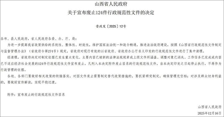 决定表示,经清理,山西省政府决定对制定依据已发生重大变化、主要内容已被新的法律法规规章或上级文件所涵盖、调整对象已消失、工作任务已完成或内容已不适应经济社会发展的124件行政规范性文件宣布废止。凡列入本决定附件废止目录的行政规范性文件,自本决定印发之日起停止执行,不再作为行政管理的依据。