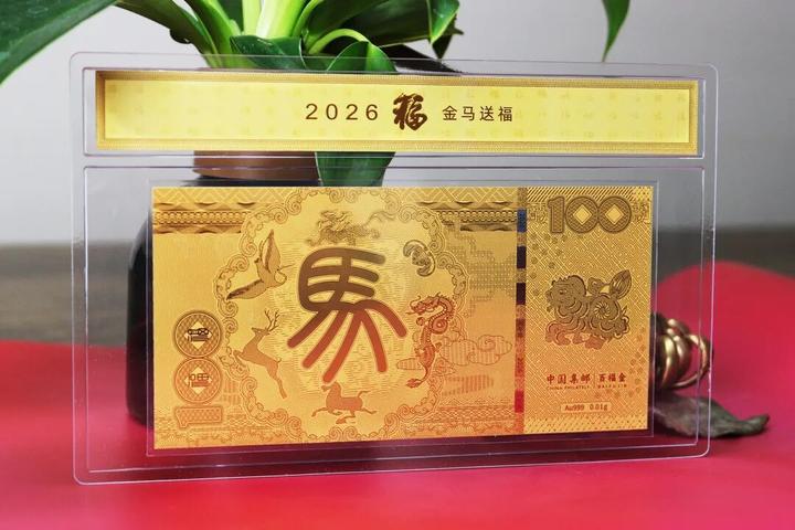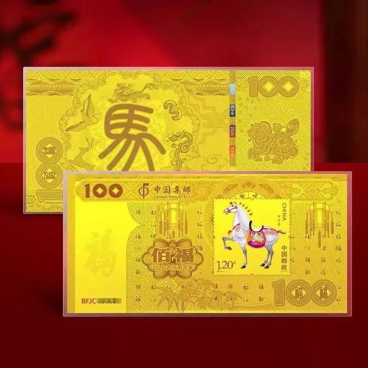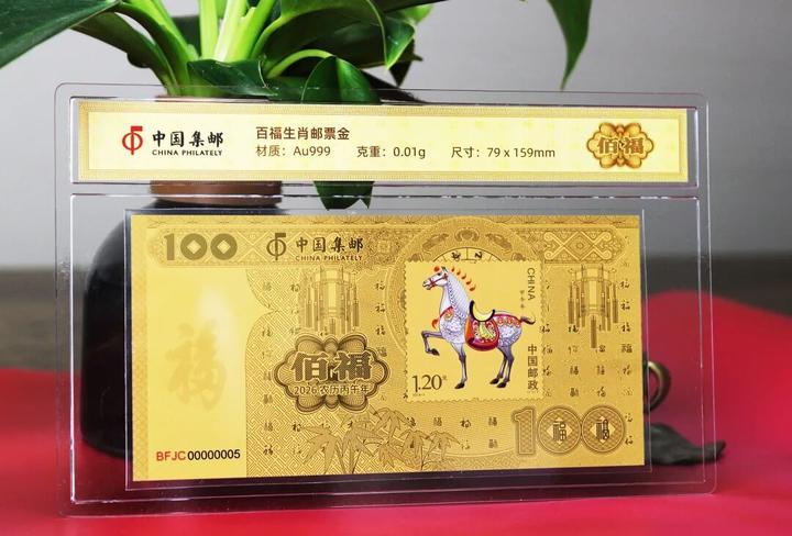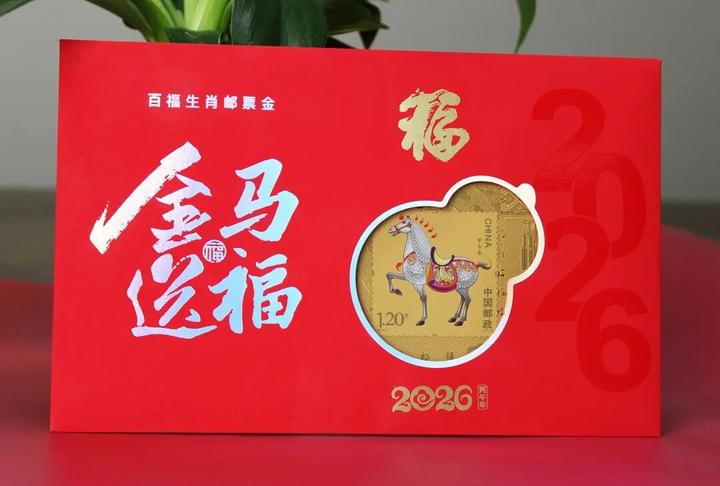 中国集邮精心打造的《2026金马送福·马年百福生肖邮票金》,把生肖、福运、黄金三种大家喜爱的元素,全揉进一张卡里!