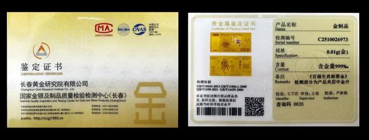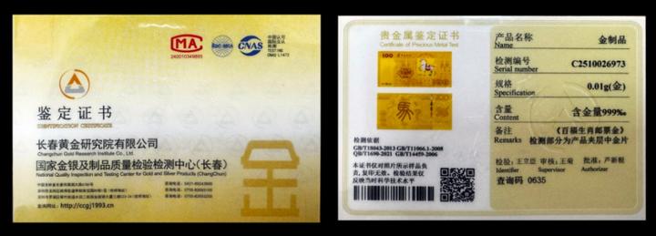 随附国家金银及制品质量检验检测中心出具的鉴定证书,为您珍藏的每一份金钞价值提供价值证明。