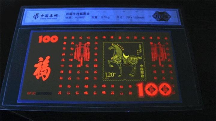 全彩荧光防伪,紫光灯百福齐亮,马儿金鬃流光,如同一件掌心上的艺术品。