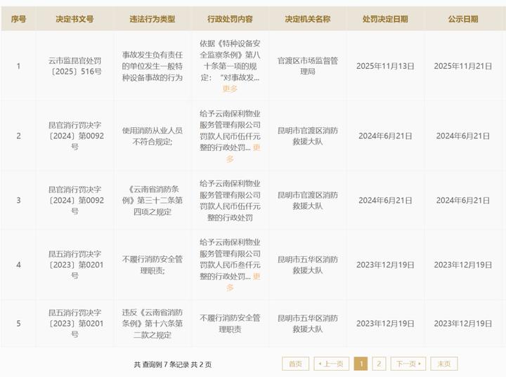 公开资料显示,云南保利物业服务管理有限公司成立于2008年,系保利置业集团成员,此前曾多次被消防救援部门处罚。