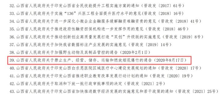 在公布的文件目录中,2020年8月17日发布的《山西省关于禁止生产、经营、储存、运输和燃放烟花爆竹的通告》也被宣布废止。