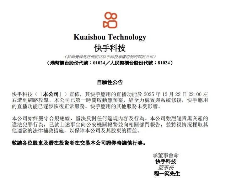 12月23日,快手发布公告称,公司快手应用的直播功能于12月22日22:00左右遭到网路攻击,公司已第一时间启动应预案,经全力处置与系统修复,快手应用的直播功能已逐步恢复正常服务。快手应用的其他服务未受影响。