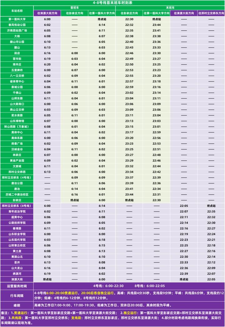 此外,4、8号线和6号线东段开通后,1、2、3号线列车的到发时刻、停站时间均有调整。您可通过“济南地铁”App查询全天列车到站时刻,合理规划出行行程。