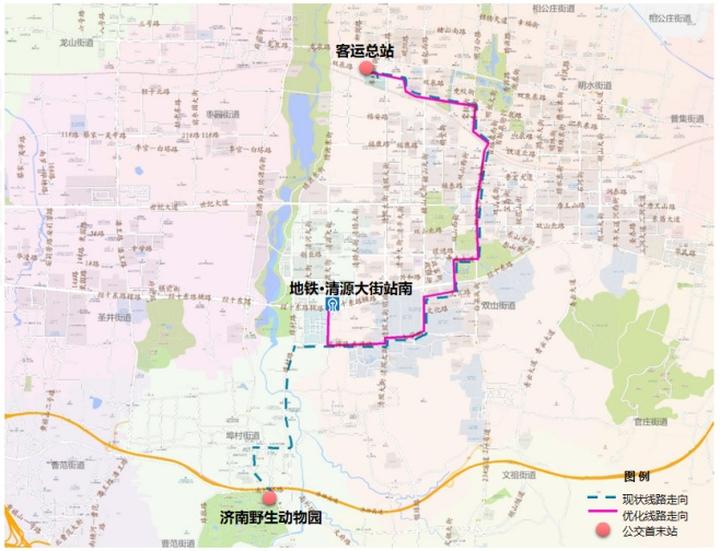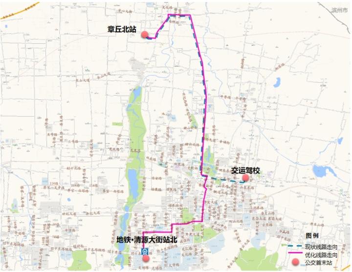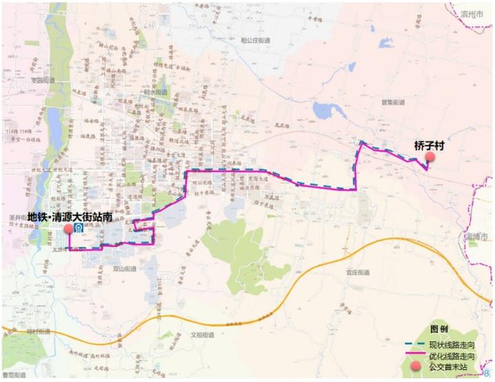 调整线路:整体线路走向不变。在清源大街与经十东路交叉口北侧增设“地铁·清源大街站北”公交站点。其他线路站点不作调整。