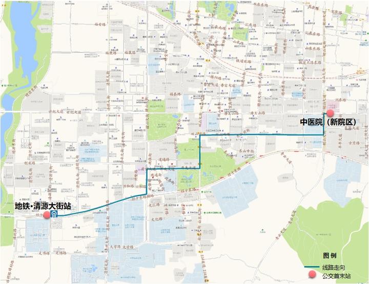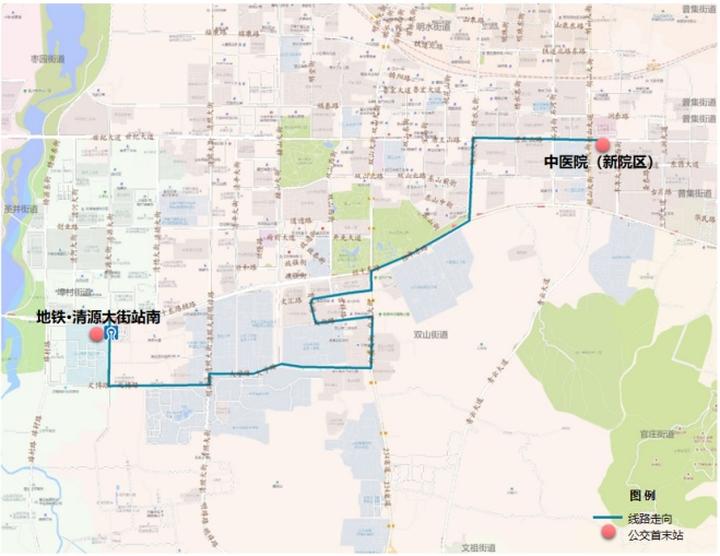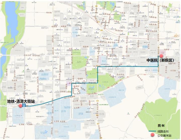 线路走向:由地铁·清源大街站发车,沿优化后的14路公交线路运行至中医院新院区。