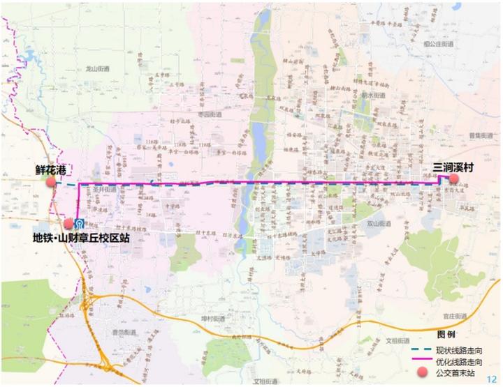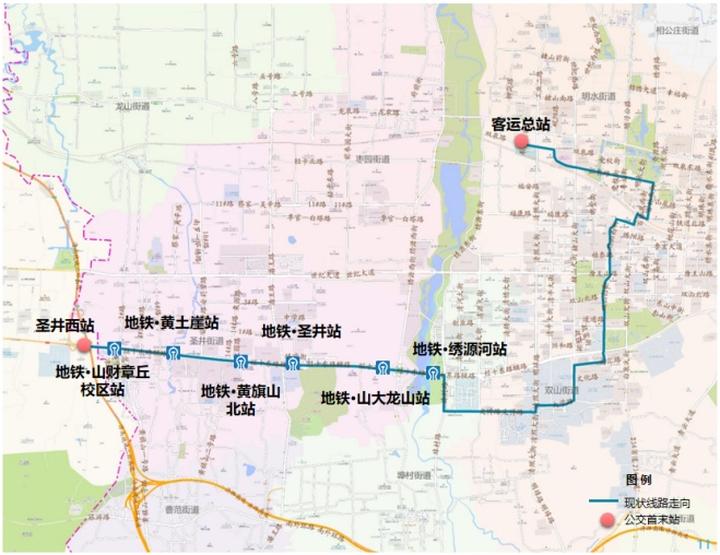 调整线路:整体线路走向不变。地铁接驳设施建设完成后,进驻地铁·绣源河站、地铁·山大龙山站、地铁·圣井站、地铁·黄旗山北站、地铁·黄土崖站、地铁·山财章丘校区站停靠运行。其他线路站点不作调整。