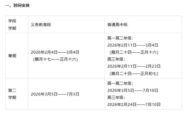 寒假开始时间为2026年2月11日,高一、高二年级开学时间统一为2026年3月5日,高三年级开学时间为2026年2月24日,寄宿制学校可提前一天安排学生报到。