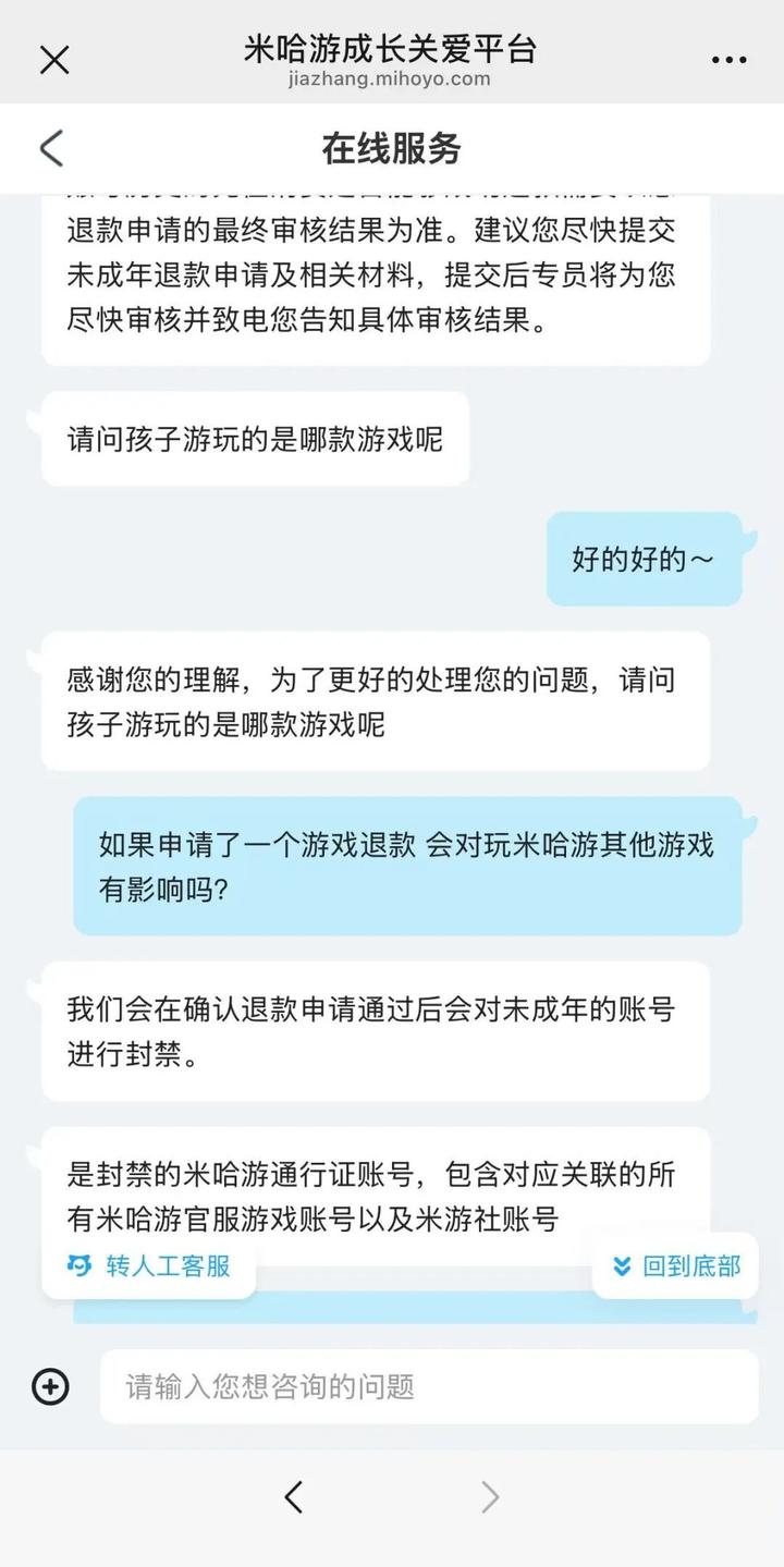 米哈游客服同样提供了需要的证明材料清单,并表示退款金额以实际审核结果为准。而被问及申请未成年人充值退款是否会影响其他游戏,客服回复“申请通过后会对未成年的账号进行封禁”,且“封禁的是米哈游通行证账号”。