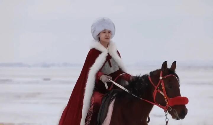 当时昭苏已经下雪了,天马旅游文化园还是会不定时举办小型的“万马奔腾”活动:上百匹骏马被同时放出,在白雪皑皑的草原上疾驰,极为壮观。贺娇龙穿上了原本给网络红人准备的、作为道具的红色汉服,披着一件有白色毛领的红色披风,戴着毛茸茸的白圆帽,在雪地上骑马驱驰着更多马儿往远方跑去。