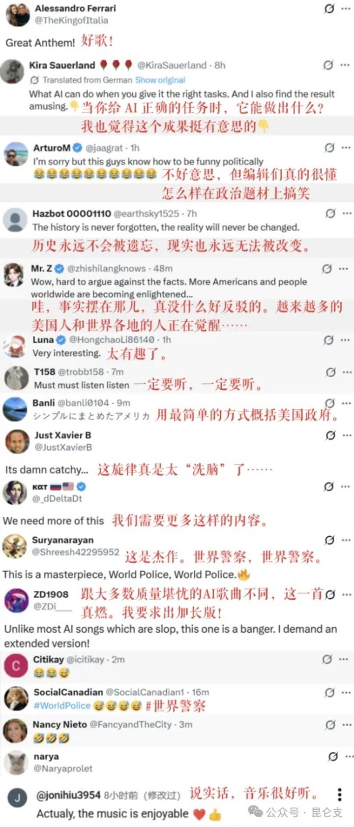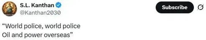 印度地缘政治专家S.L. Kanthan特地选取MV中的金句:“世界警察,世界警察,攫取石油,称霸天下”,并点赞说:“干得漂亮。”
