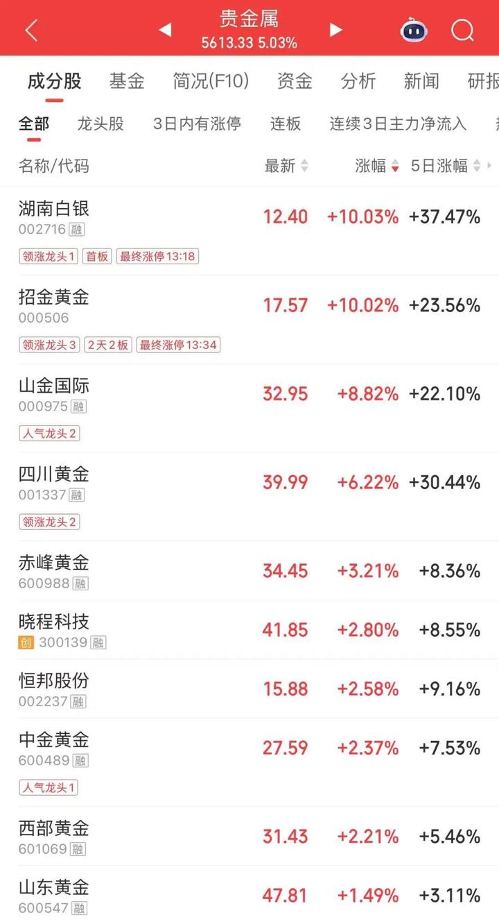 贵金属概念午后走高,湖南白银、招金黄金涨停,西部黄金、中金黄金、赤峰黄金、晓程科技、四川黄金跟涨。