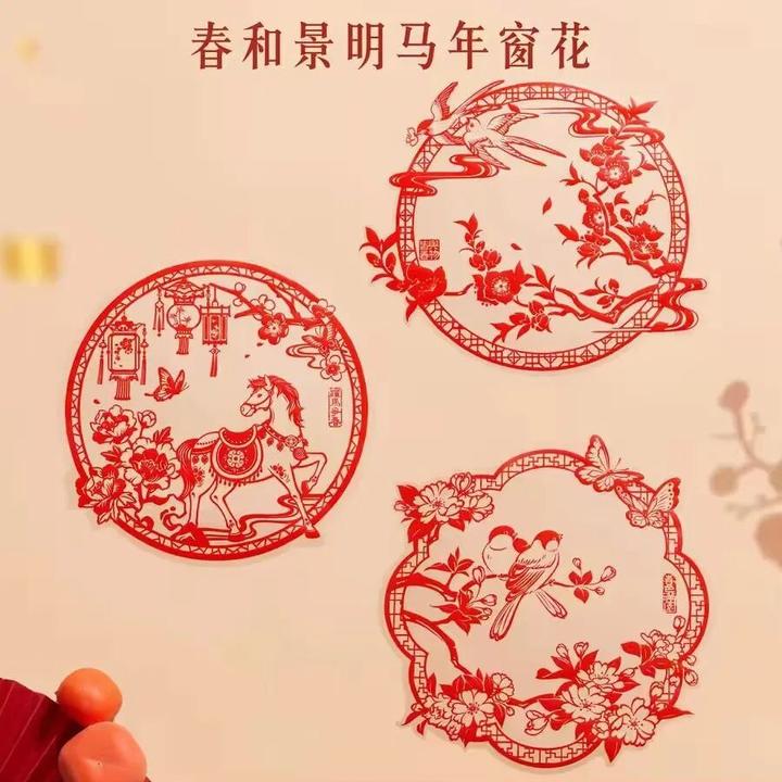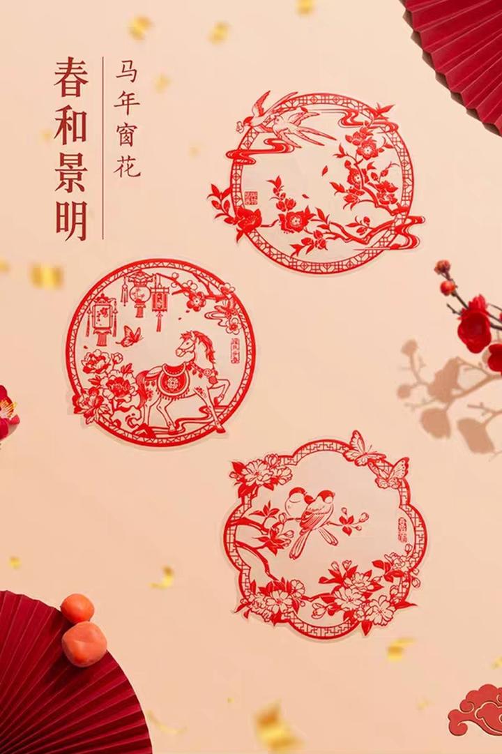 窗花含三个款式:跃马争春、春色满园、与物皆春。