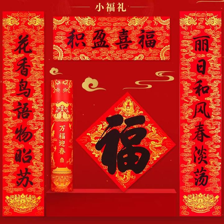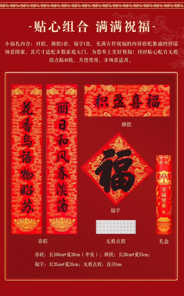 小福礼内含:对联、横批1套、福字1张,充满吉祥祝福的内容搭配繁盛的祥瑞场景图案。