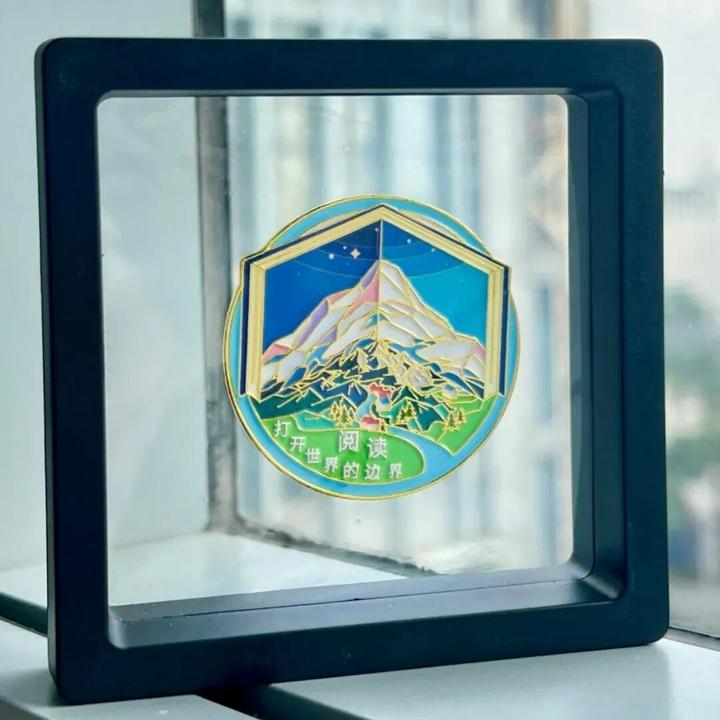 这是我们原创设计的一枚纪念徽章,徽章的正面是书本,书中有星空、雪山、河流、森林、小镇......
