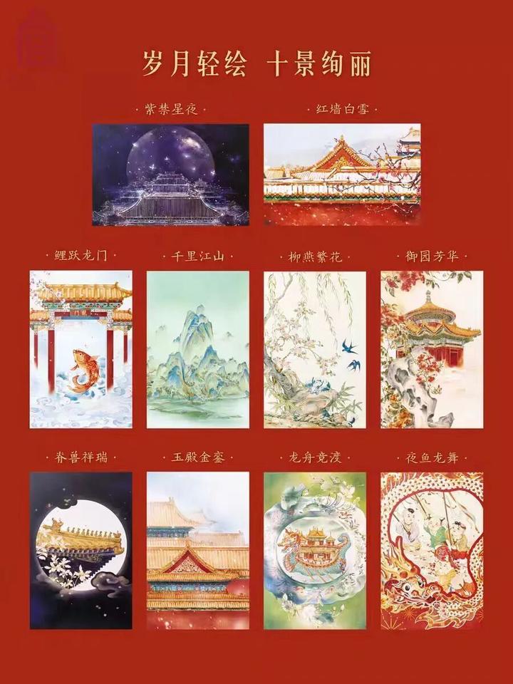 一套10张,款式有:鲤跃龙门、千里江山、柳燕繁花、御园芳华、脊兽祥瑞、玉殿金銮、紫禁星夜、龙舟竞渡、夜鱼龙舞、红墙白雪。