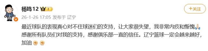 据封面新闻消息,1月26日下午,辽宁沈阳三生飞豹篮球俱乐部主教练杨鸣发文回应辞职:“最近球队的表现真心对不住球迷们的支持,让大家很失望,我非常内疚和惭愧,感谢所有队员们对我的支持,感谢俱乐部一直的信任。辽宁篮球一定会越来越好,加油。”