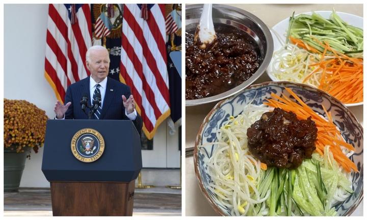 拜登与炸酱面。左图中新社记者 陈孟统 摄 右图图源网络