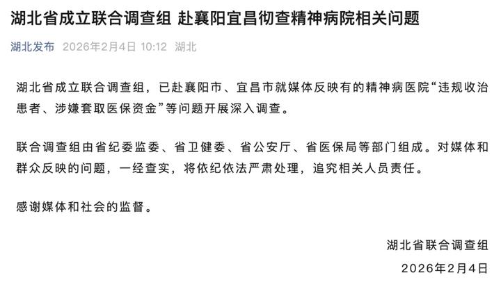 湖北省成立联合调查组,已赴襄阳市、宜昌市就媒体反映有的精神病医院“违规收治患者、涉嫌套取医保资金”等问题开展深入调查。