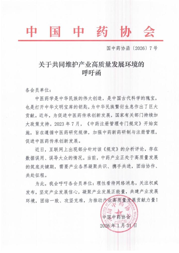 中国中药协会2月2日发布的《关于共同维护产业高质量发展环境的呼吁函》指出,当前网络流传的部分解读存在数据误用、误导公众之嫌。文件强调,该《规定》旨在遵循中医药规律,加强中药新药研制与注册管理,推动中医药传承创新。