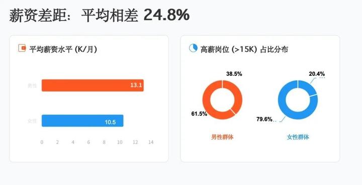 本次测试中,男测试对象收到了78条岗位邀约,女测试对象收到54条,男性收到的岗位邀约量比女性高出44.4%。薪资层面,男性平均薪资13.1K,女性为10.5K,男性平均薪资较女性高出24.8%;较高薪岗位(薪资>15K)的占比中,男性达38.5%,女性仅20.4%,男性获得较高薪岗位的机会显著更多。