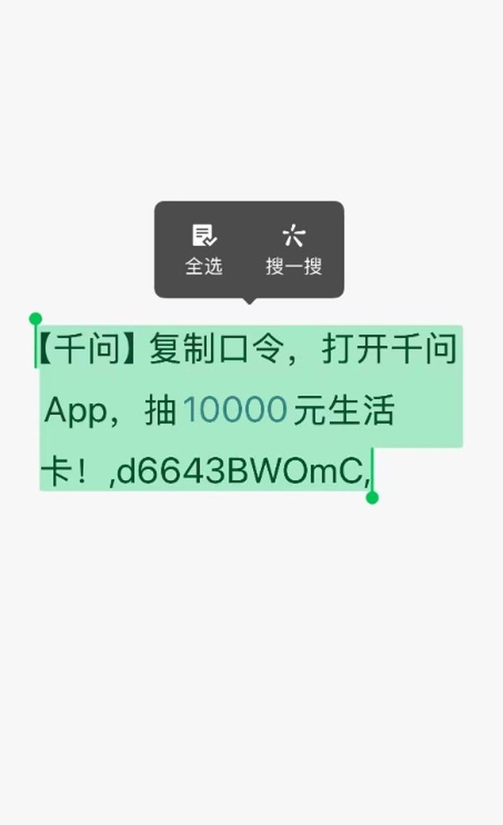 《科创板日报》6日讯,多名用户向《科创板日报》记者反馈,目前千问的春节活动口令无法在微信进行复制传播,选中千问的活动口令后,微信页面没有复制键。对此,微信未做回应。值得注意的是,目前腾讯元宝口令红包仍可复制。