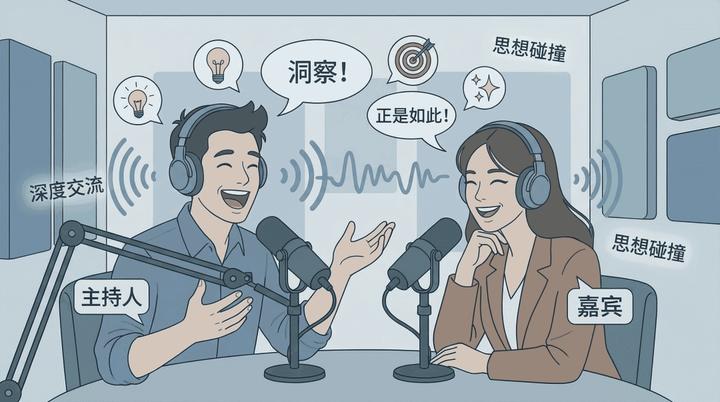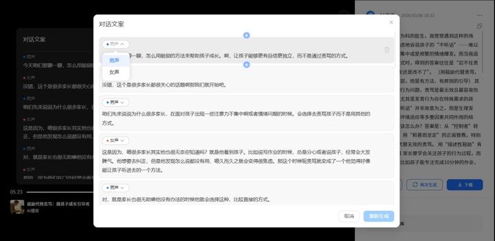 AI 会自动提取核心观点,将其改写为“主持人”与“嘉宾”的双人对话脚本。