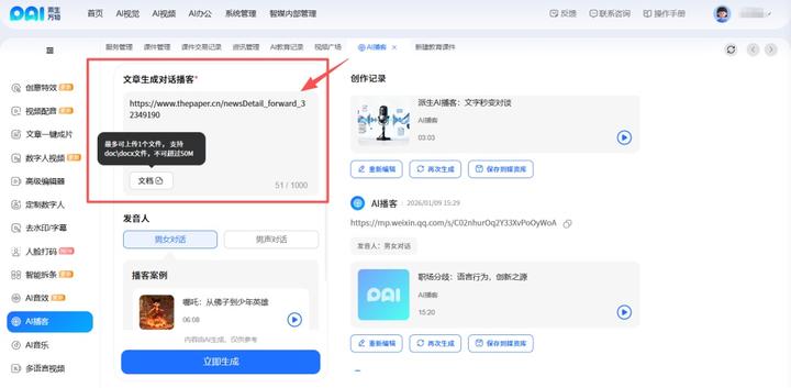 派生万物全新推出的【AI播客】 创作功能,你只需投喂内容,AI 就能为你变出一场沉浸式的双人对话播客。