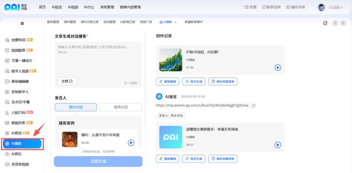 选择AI视频,点击“AI 播客”功能入口。