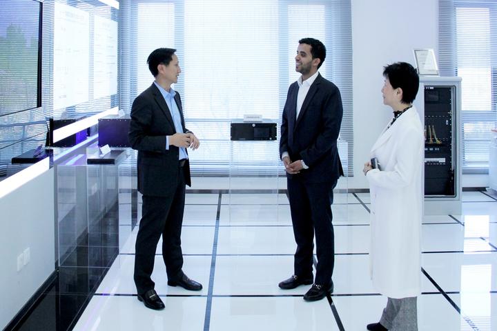 △李平(左一)为访问东土科技总部的沙特阿拉伯国家投资部代表团作讲解。